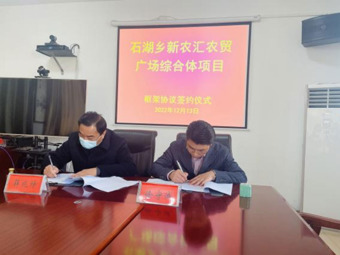 2022年12月13日,新农汇安徽公司总经理徐守诚、新农汇控股集团办公室主任李颖、新农汇安徽公司运营部总监严瑾一行三人前往蚌埠市固镇县石湖乡签署石湖乡农贸广场综合体框架协议。签订框架协议意味着石湖乡新农汇农贸广场综合体项目已经迈入新的发展阶段。
